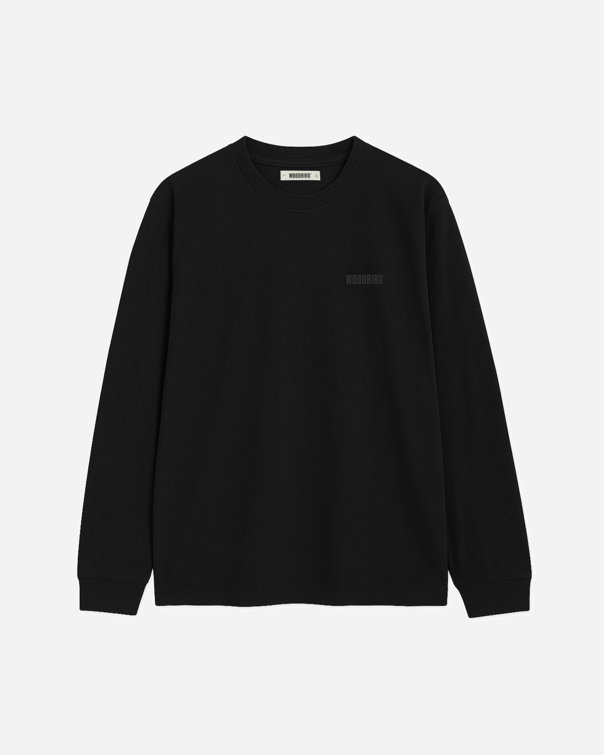 Baine Washed Tee - Black fra Woodbird er en sort T-shirt med en let vasket finish, der føles naturlig fra første dag. Den har rund hals, korte ærmer og en behagelig pasform, og det lille, broderede Woodbird-logo på brystet holder stilen enkel.