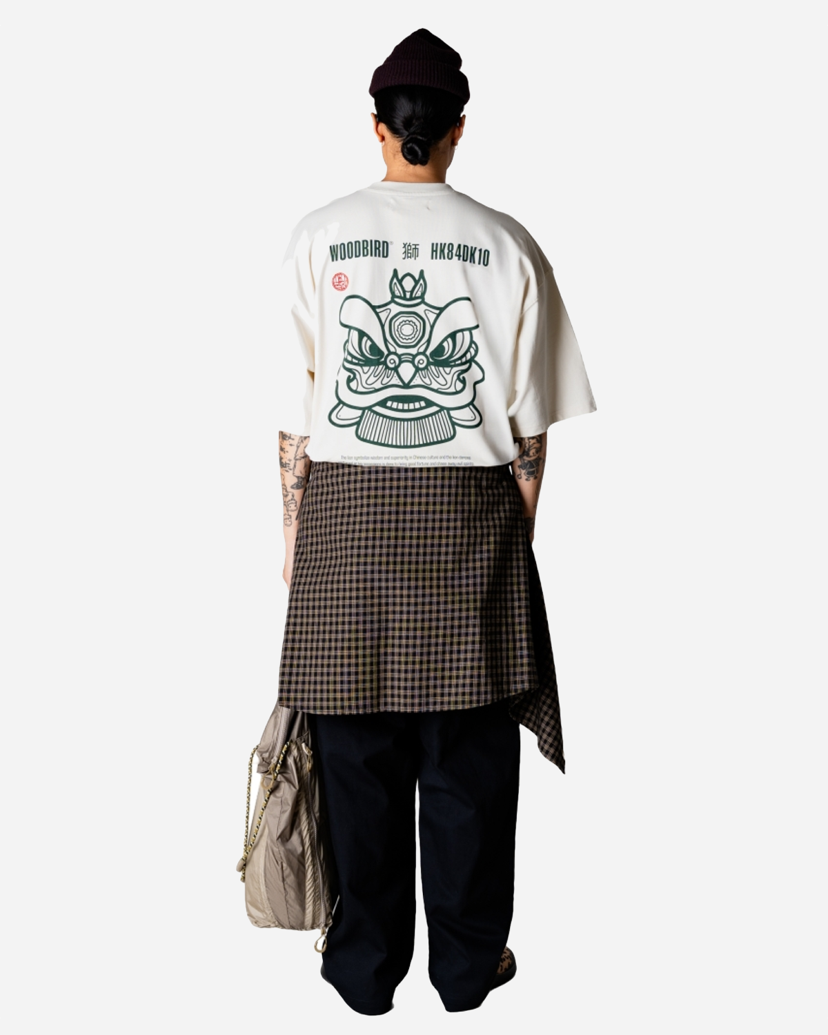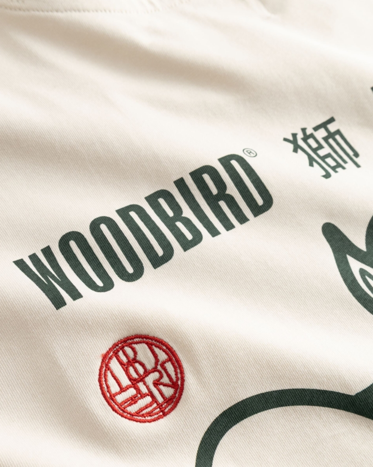 Woodbird Beam Lion Tee - Off White leverer afslappet komfort og et roligt, markant look, som T-Shirts fra Woodbird ofte gør. Den er lavet i blød, økologisk bomuld med rund hals og korte ærmer. Foran sidder et lille, centreret logo, mens ryggen får fuld opmærksomhed med et stort og detaljeret print af et kinesisk dragehoved, der giver et tydeligt statement.