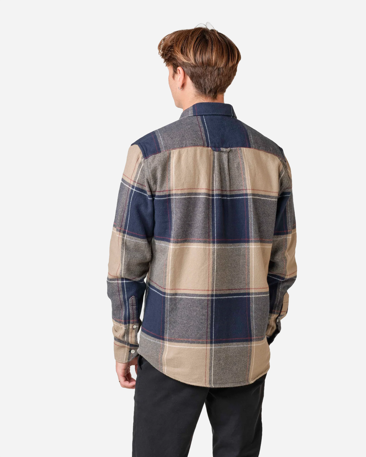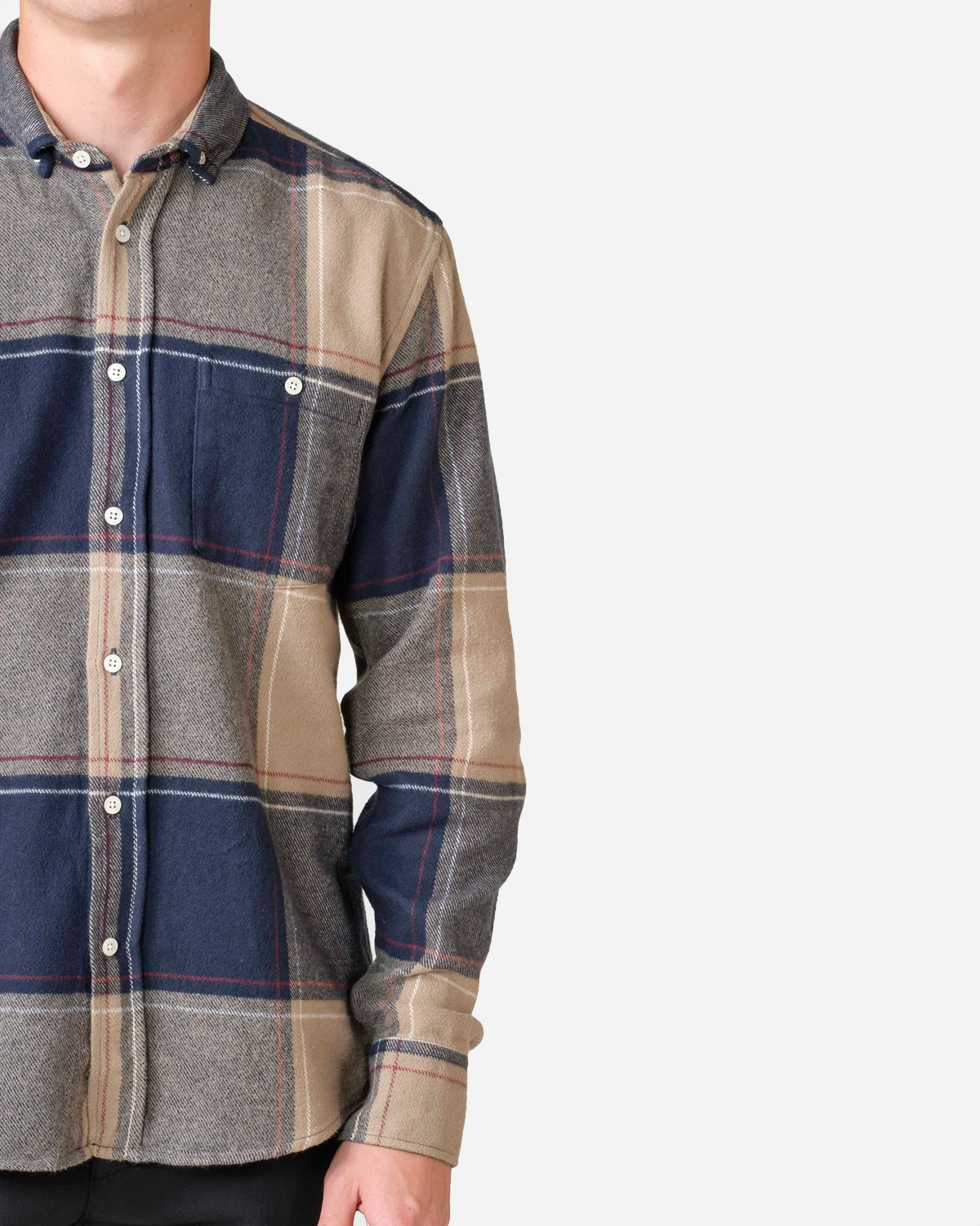 Claus Shirt fra Klitmøller Collective er en klassisk skjorte med et ternet flannel mønster i sand, navy og rød. Farverne er rolige med et diskret twist, så den er nem at have på, både til hverdag og pænere brug. Pasformen giver en afslappet skjorte, og det lidt længere bag på sørger for et pænt fald over bukserne.