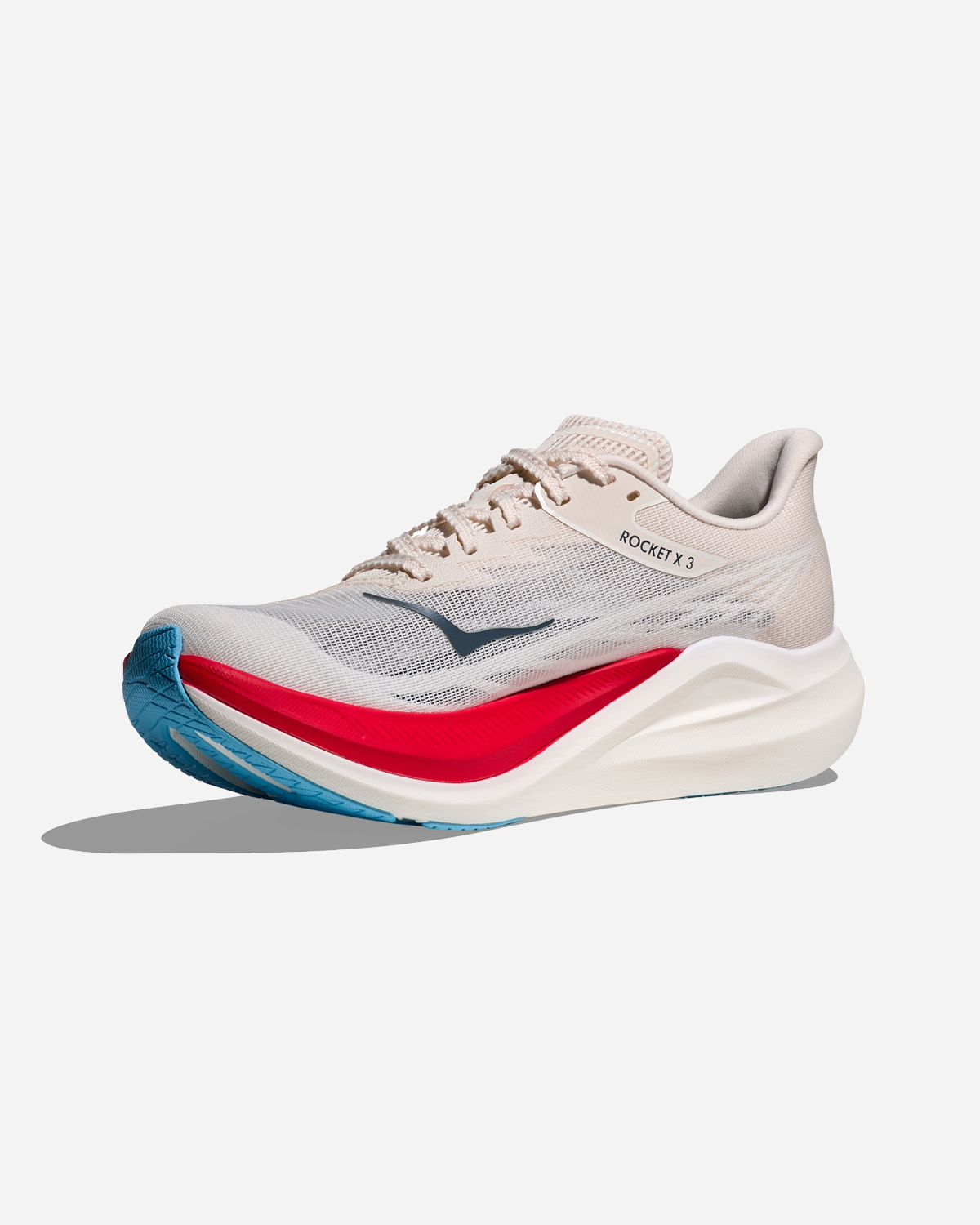 Hoka Rocket X 3 Unisex - Alabaster / Frost er en let løbesko til alt fra 5 km til marathon. Skoen kombinerer en kulfiberplade med PEBA-skum i to hårdheder, så afsættet føles hurtigt og stabilt. Den høje dæmpning og et 7 mm drop hjælper dig med at holde et behageligt tempo, også når distancen bliver lang.