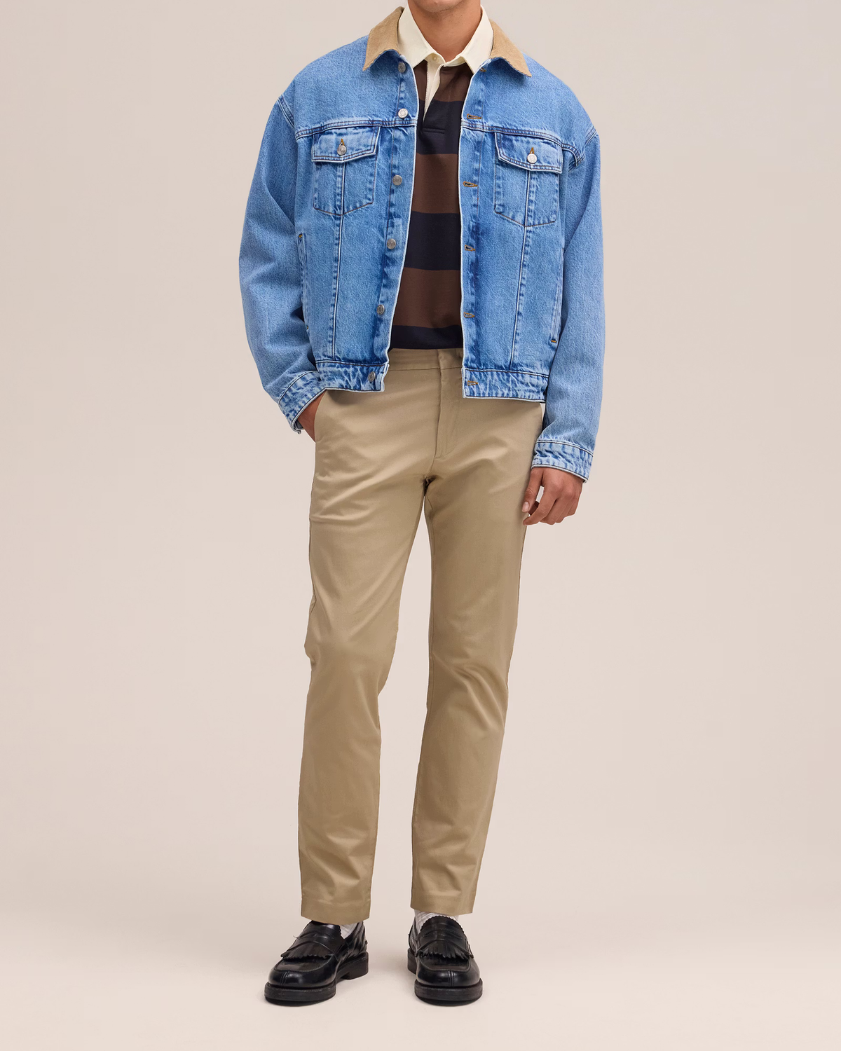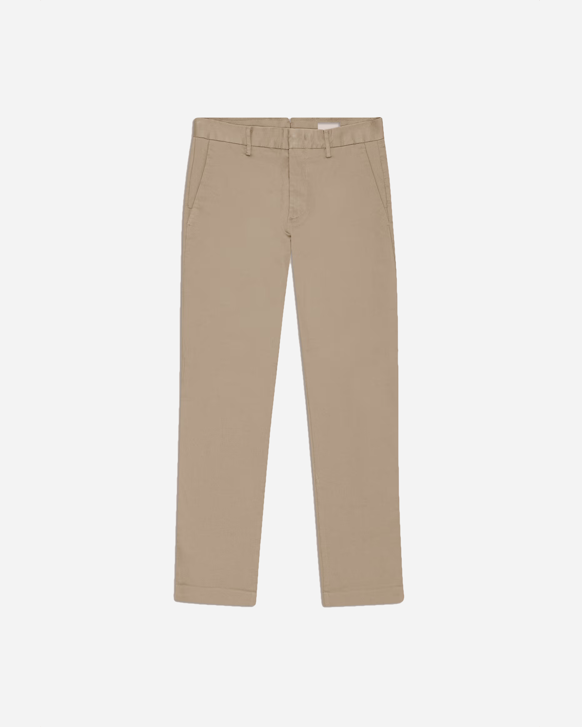 Stoffet er en 260 g/m2 blød, økologisk bomuldsblanding fra italienske Progetto Uno med en anelse stretch, så bukserne er behagelige at have på hele dagen. En tydelig pressefold og blind oplægning giver et rent fald, der holder formen pænt.