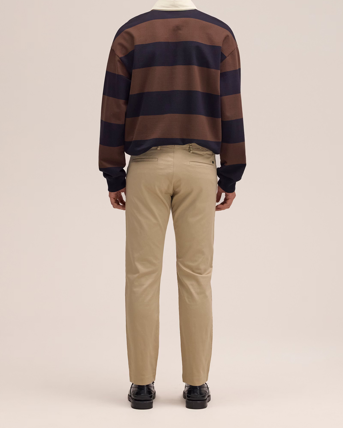 NN07 Theo 1420 - Khaki Beige er et par slankt skårne bukser i chino-snit med mellemhøj talje og let tilspidsede ben. Bukserne lander i den pæne ende uden at føles formelle, så de fungerer lige godt på kontoret og i hverdagen.
